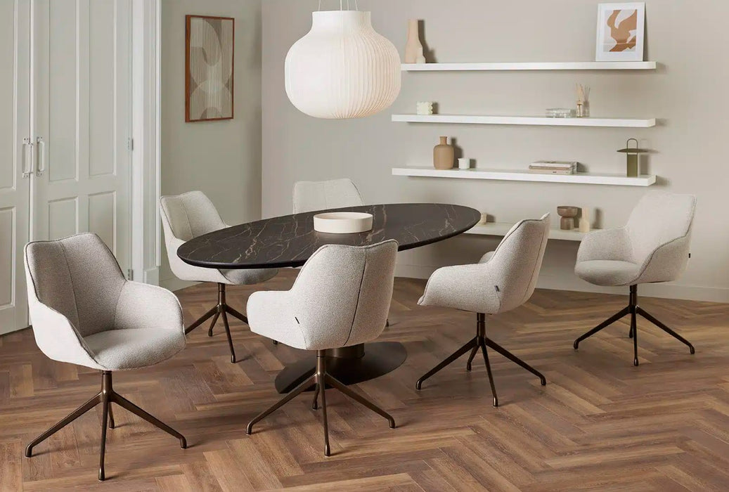 De draaibare kuip kan worden uitgevoerd met een autoreturnframe voor extra gebruiksgemak. Standaard zijn viltglijders aanwezig, kunststofglijders zijn optioneel. Deze design eetkamerstoel is volledig naar wens samen te stellen en past in elk interieur.