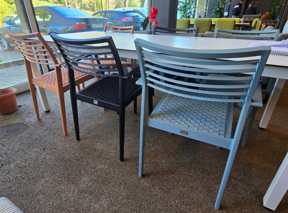 Onderhoudsvriendelijke dining stoelen die het hele jaar buiten kunnen blijven staan.